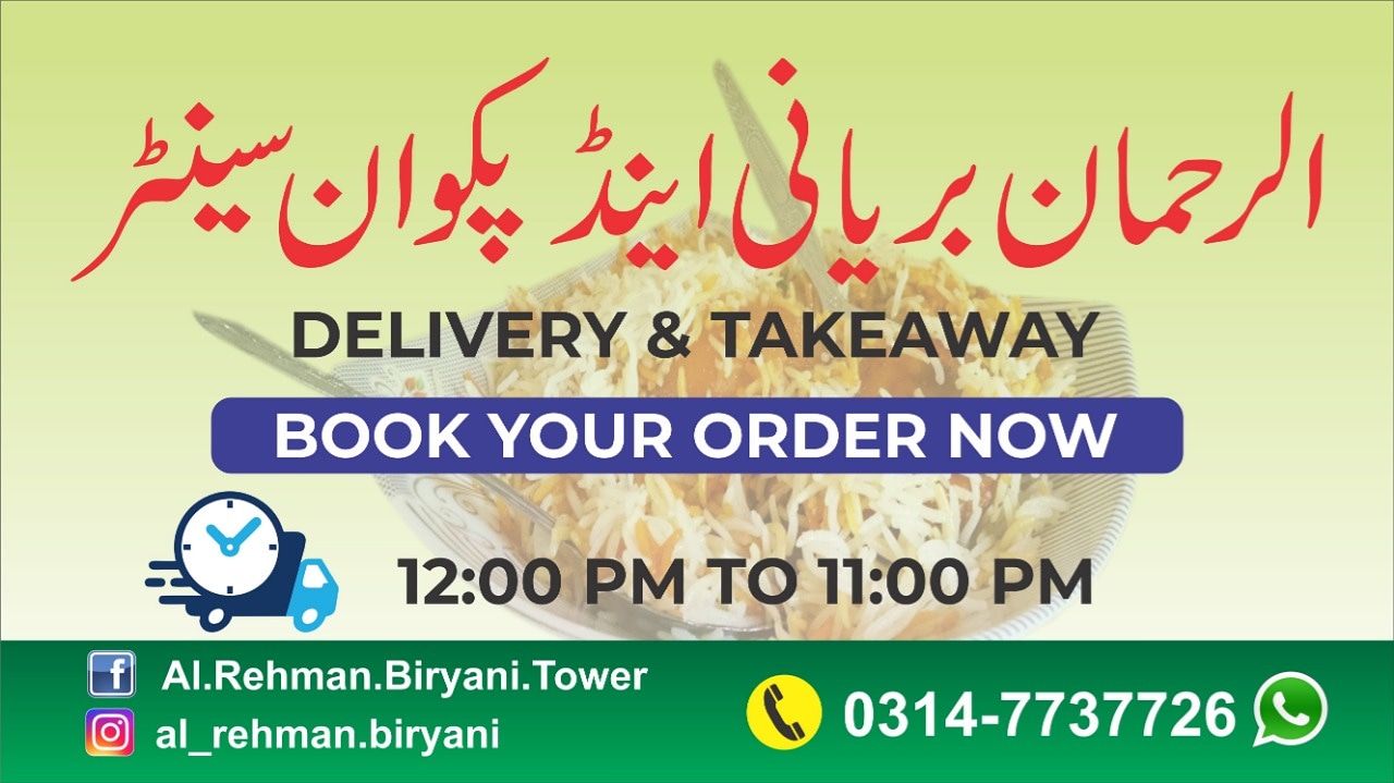 Al-Rehman Biryani is well known tasty biryani located in Kharadar Karachi and established in 1990. We officially started our online delivery to limited areas of Karachi, www.facebook.com/Al.rehman.biryani.tower official Facebook page , like & follow us.