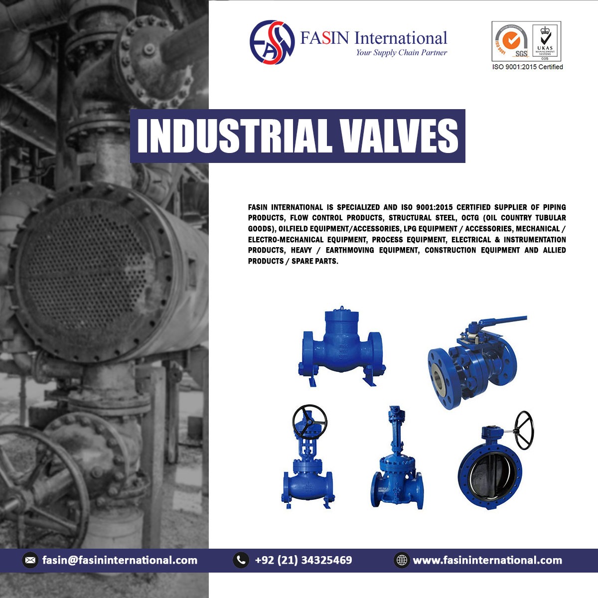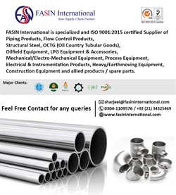 FASIN International is specialized and ISO 9001:2015 certified Supplier of Piping Products, Flow Control Products, Structural Steel, OCTG (Oil Country Tubular Goods), Oilfield Equipment/Accessories, LPG Equipment/Accessories, Mechanical/Electro-Mechanical Equipment, Process Equipment, Electrical & Instrumentation Products, Heavy/Earthmoving Equipment, Construction Equipment and allied products / spare parts.