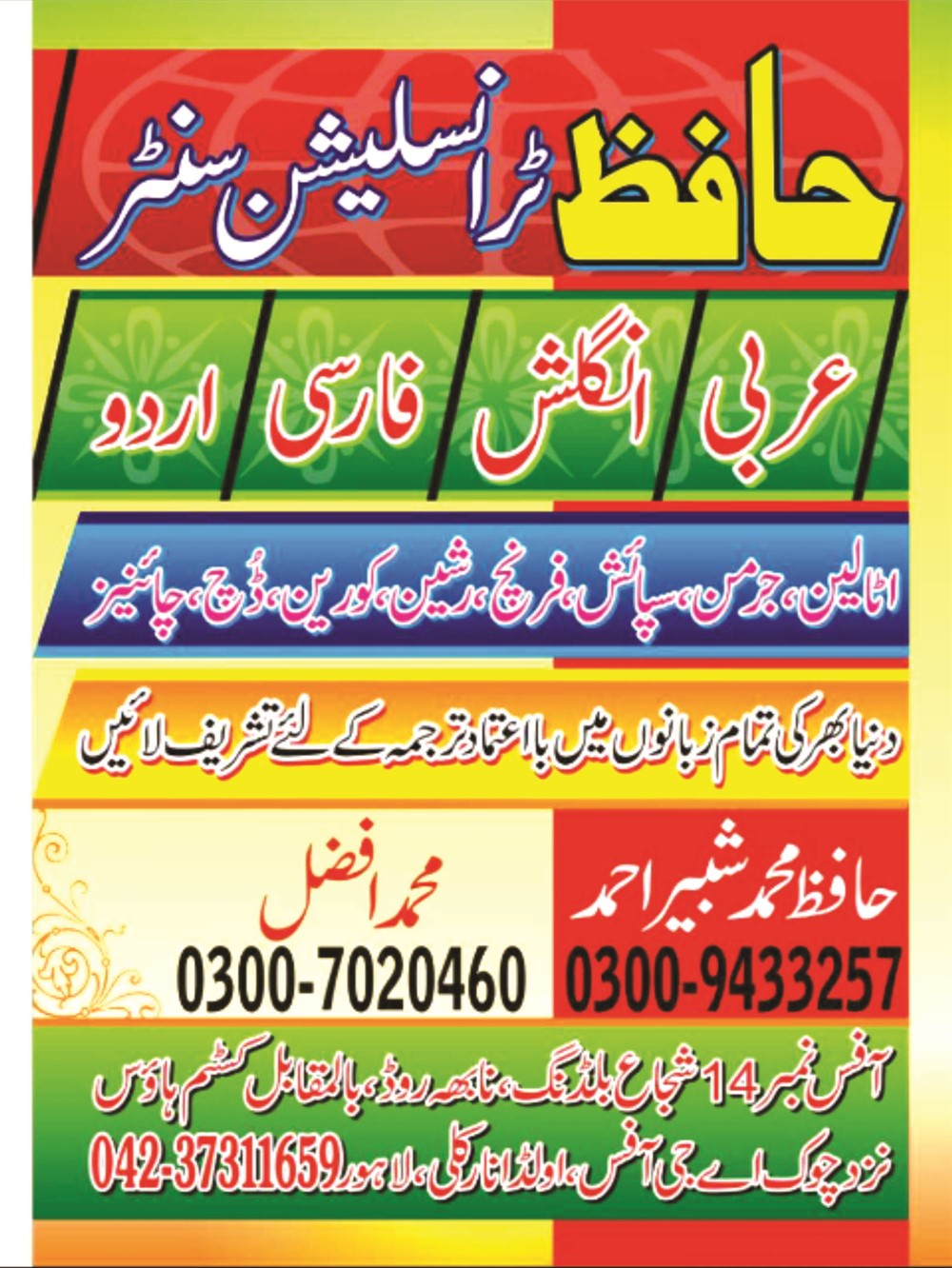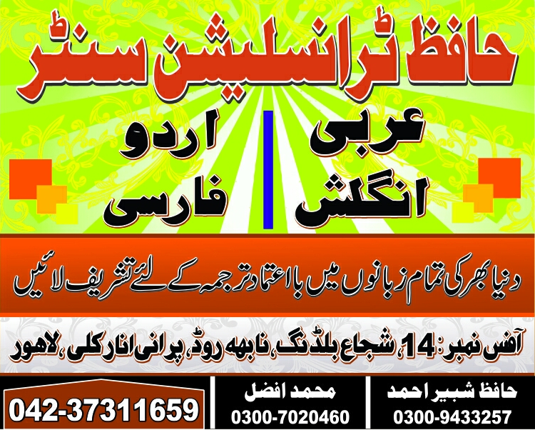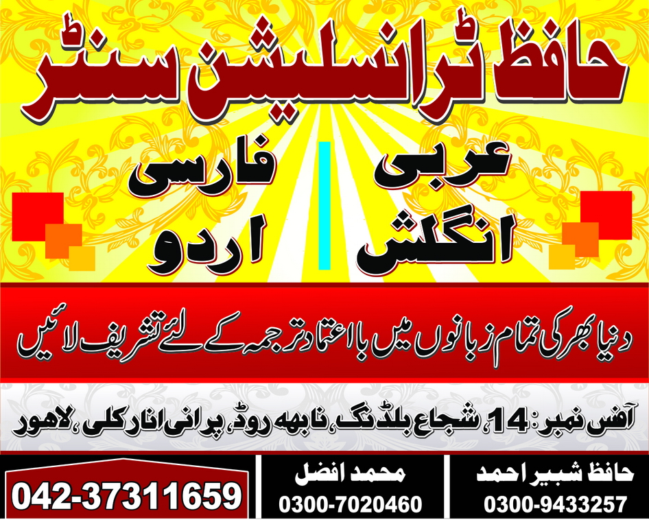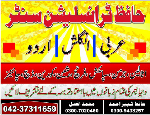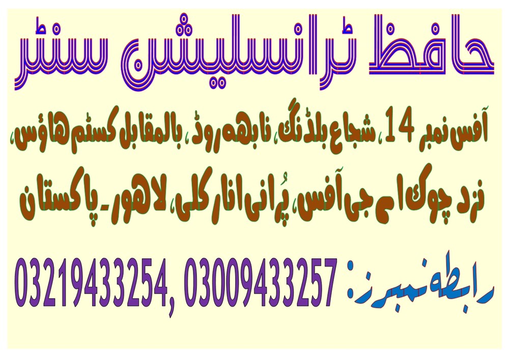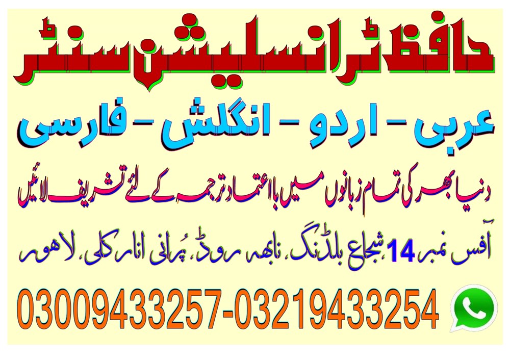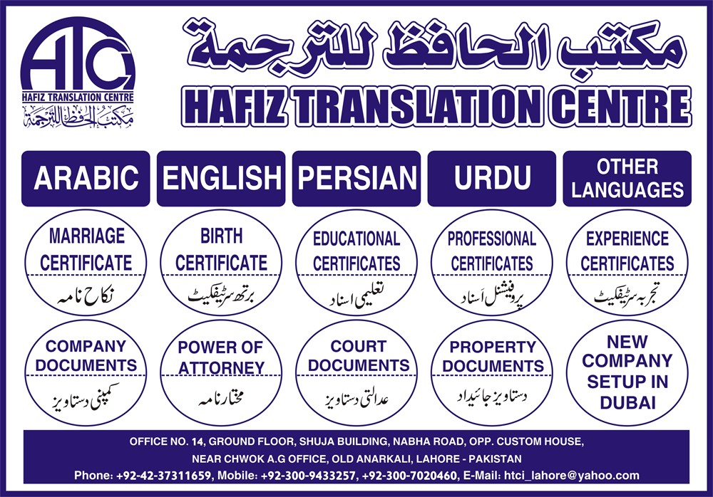 Hafiz Translation Centre (htc) offers you the top, fastest, accurate & quality rich top one translation services in Lahore. Being in the translation industry for over 11 years of excellence experience, we are proud to say that we partner with over 1000+ best brands across the globe. Our clients love our super-fast response and high-quality translations which we deliver in short time. contact us: 03009433257, 04237311659