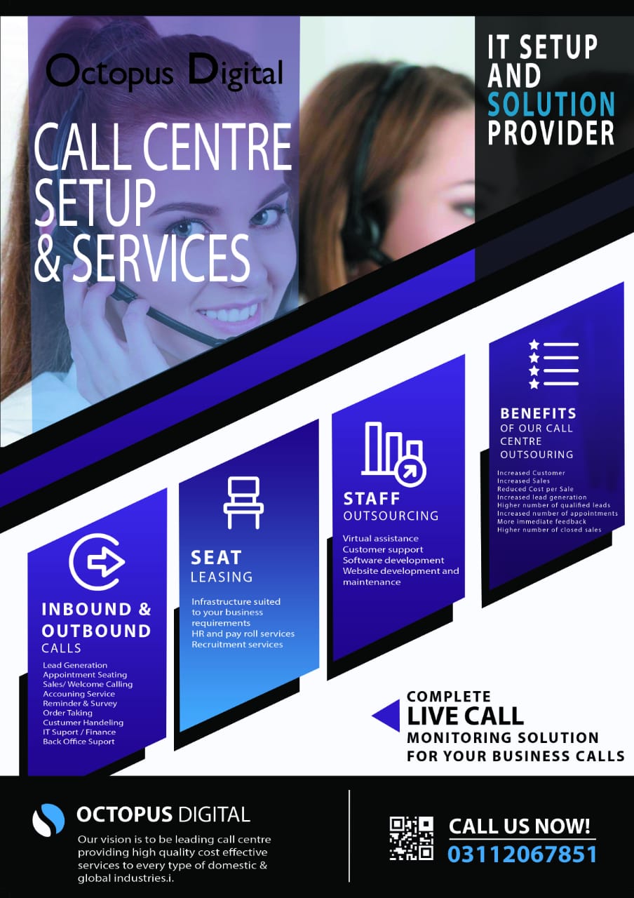 We are an offshore outsourcing Call Center, Website Design and Software Development Company in Pakistan. Whereas our company helps the organization in Call Center Setup and Outsource Services, Design and develop their Website, School Management System, Hospital data management System, Time & Attendance System, File & Documents Management System, Graphic Design, Video Editing, Domain Registration, and Hosting Space, Facebook Page Management, Social Media Marketing, Search Engine Optimization, Google AdWords, Mobile App Development, IT Maintenance Contract, Networking and Data Center Services to loyal and most precious clients. Founded in, 2017 with the aim of providing the qualitative services with the commitment of customer relationship management services.